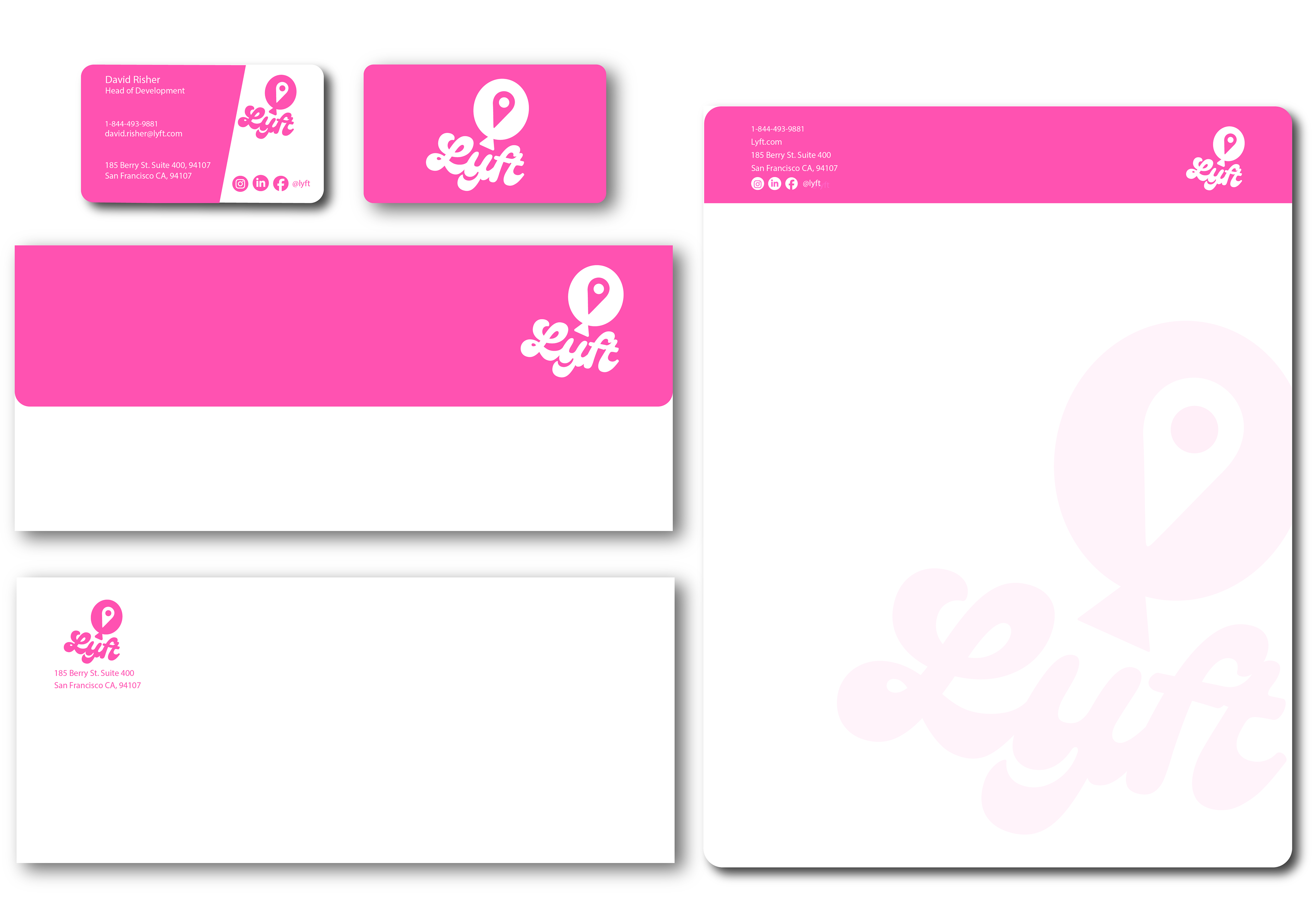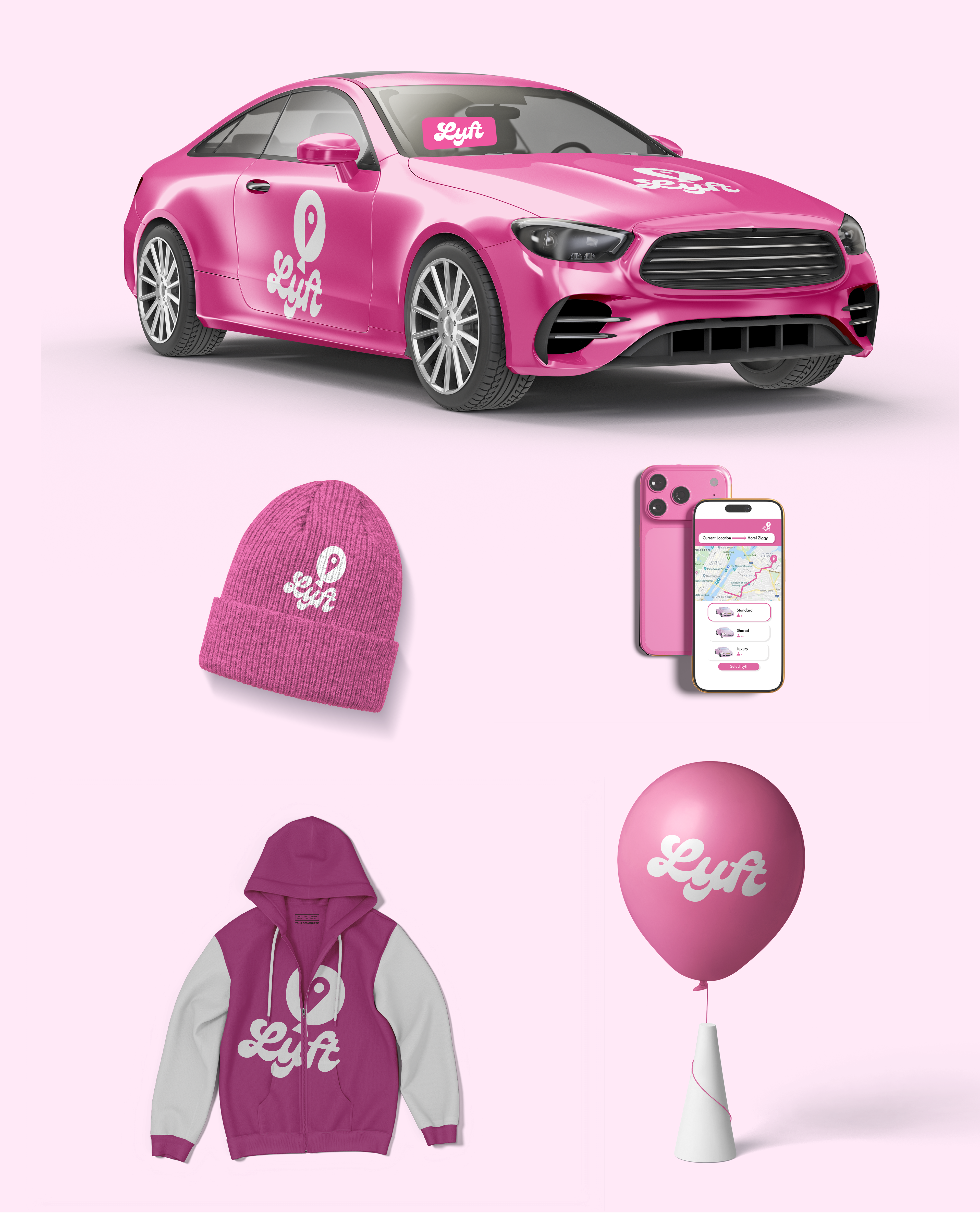 A full rebrand of Lyft featuring a modernized logo, refreshed visual identity, and applied mockups across stationery and brand touchpoints