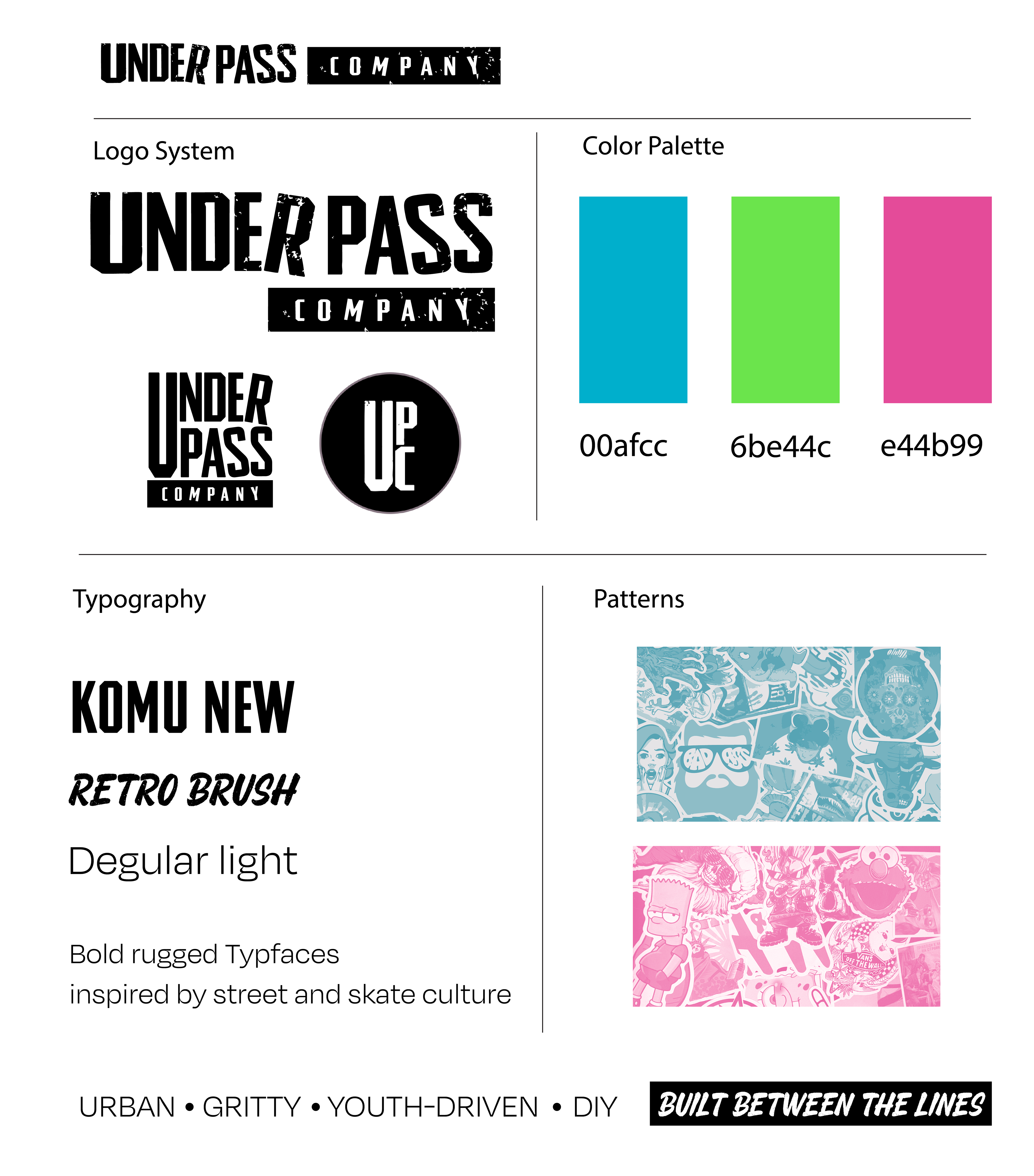 I created a skate brand with a punk-driven aesthetic aimed at youth with a rebellious spirit. The identity draws from DIY punk and skate culture through sticker-bomb graphics, distressed textures, and a bold color palette of sonic blue, magenta, and green, creating a raw and expressive visual language.