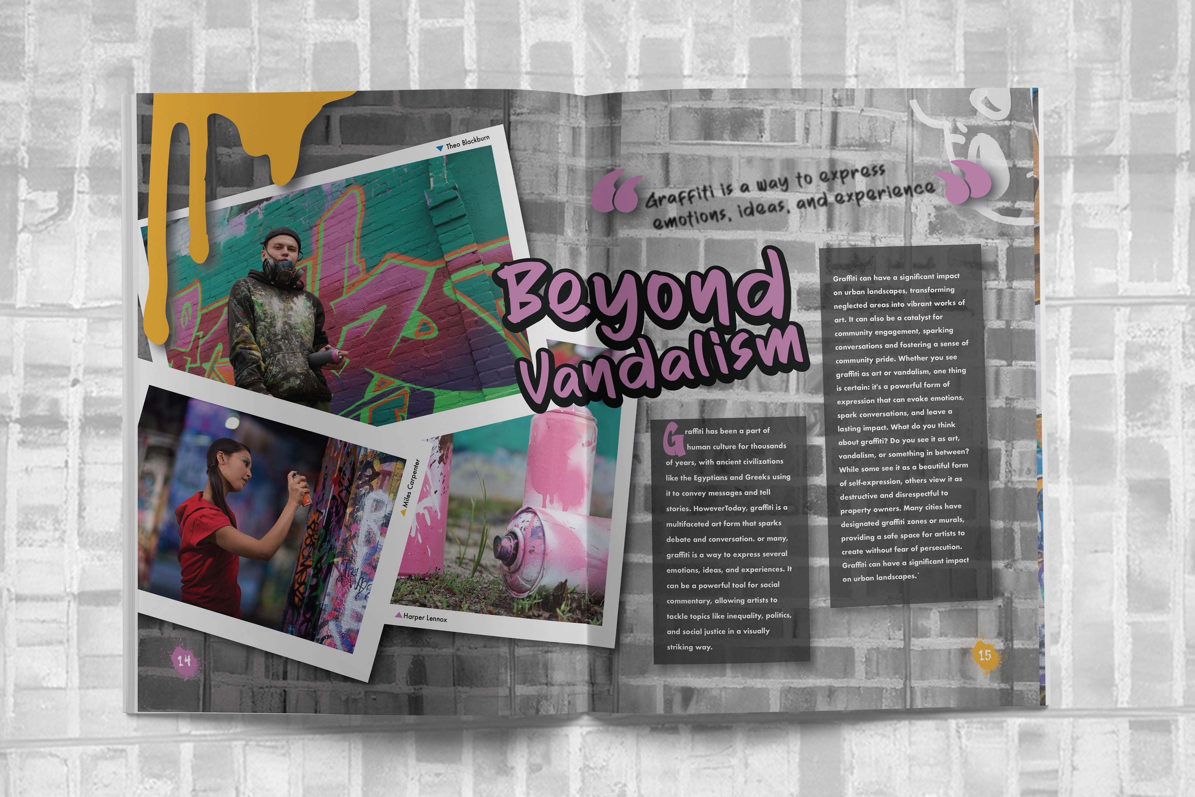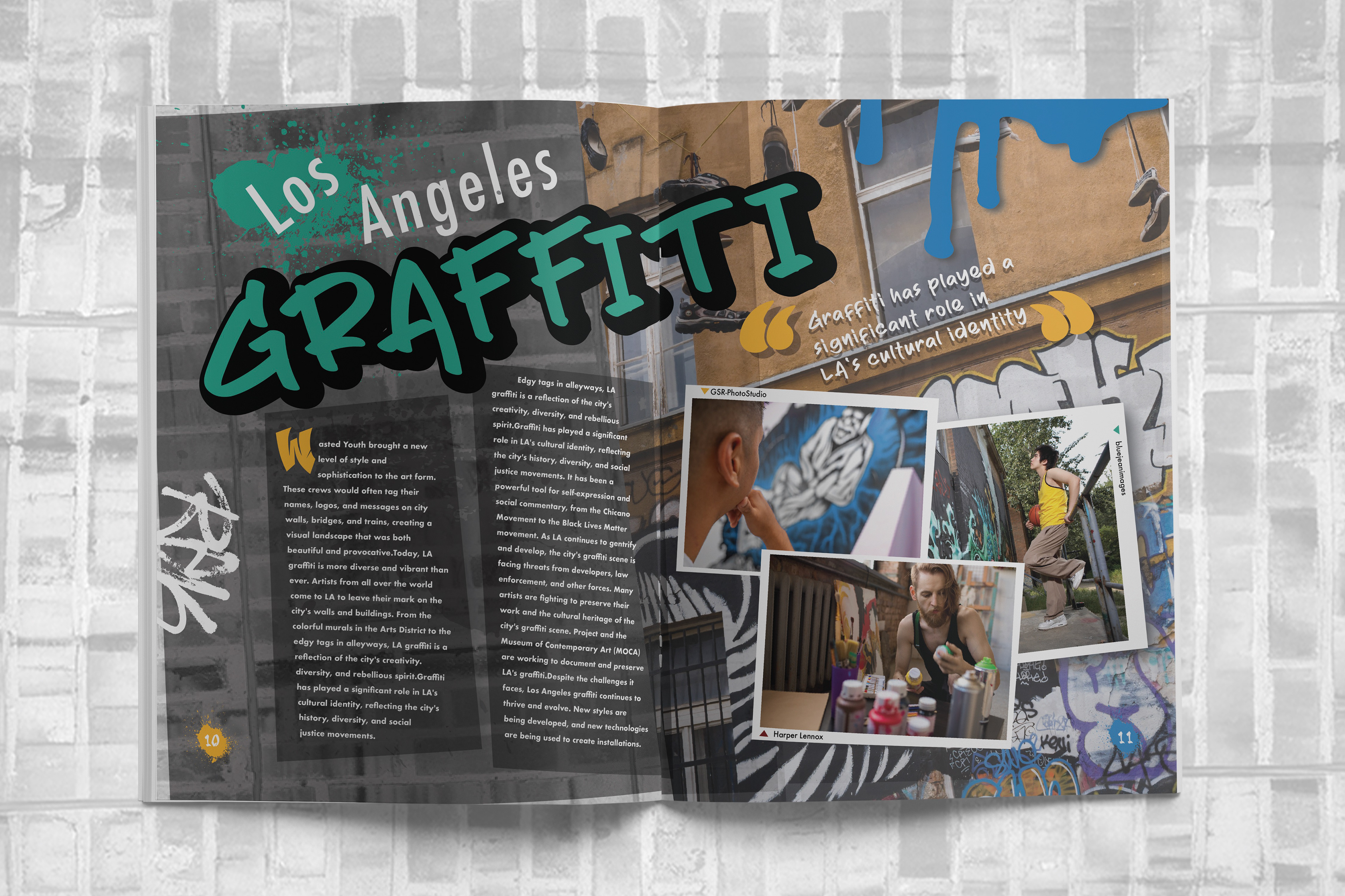 I created a series of magazine spreads exploring the Los Angeles graffiti scene, incorporating relevant imagery and photography to highlight the visual language, culture, and environment surrounding street art in the city. The layouts balance typography and image to reflect the raw, layered nature of graffiti while maintaining editorial clarity.