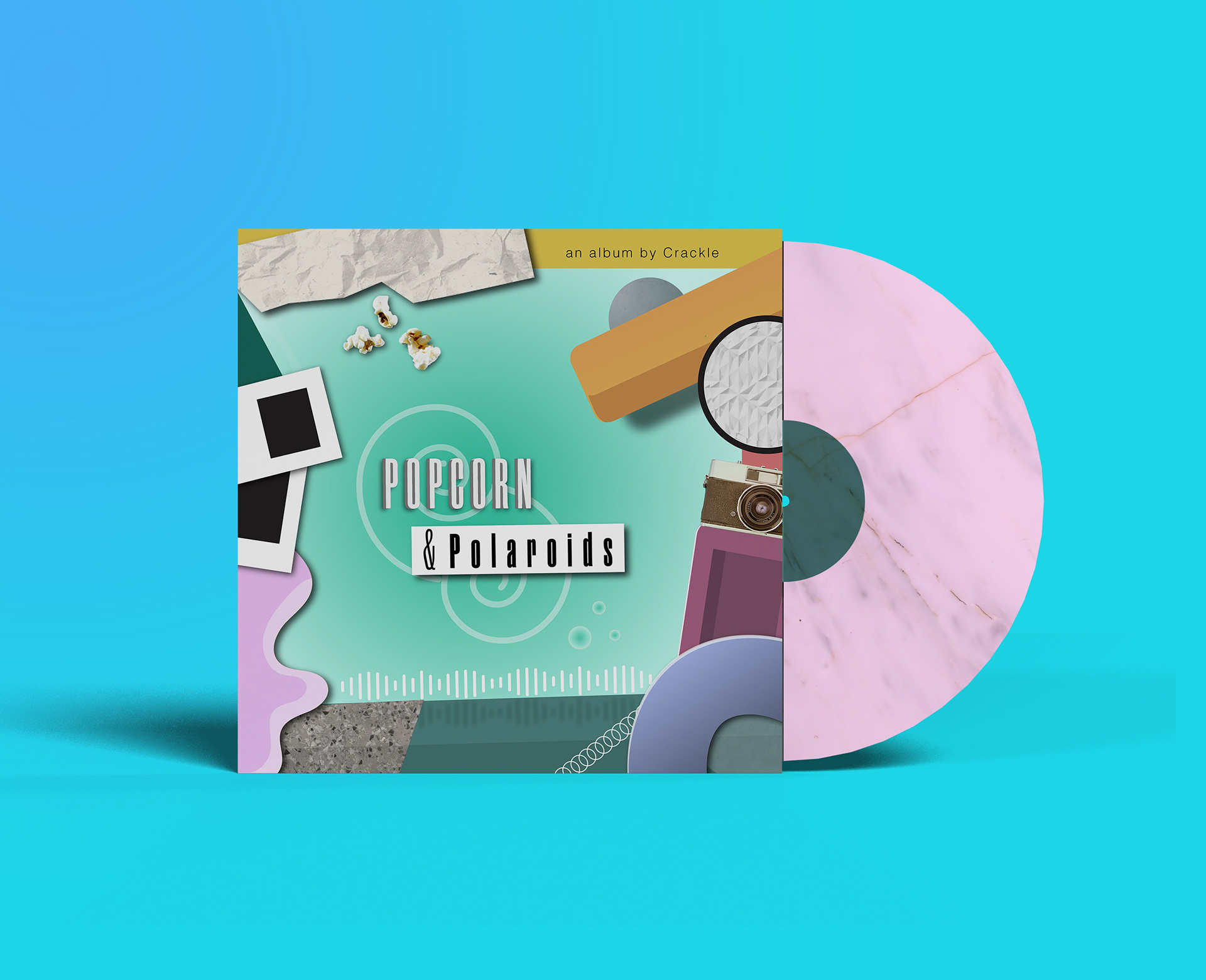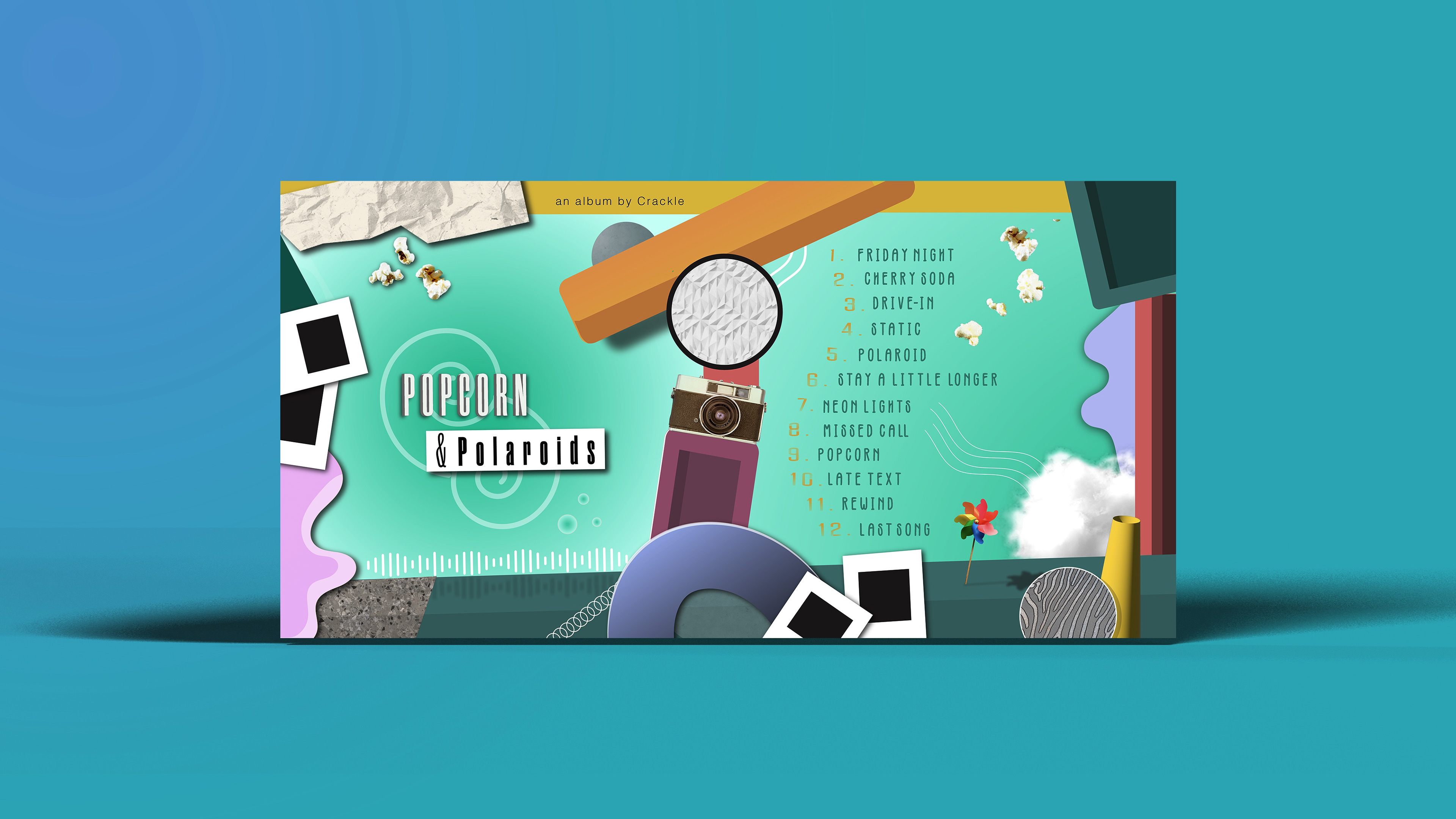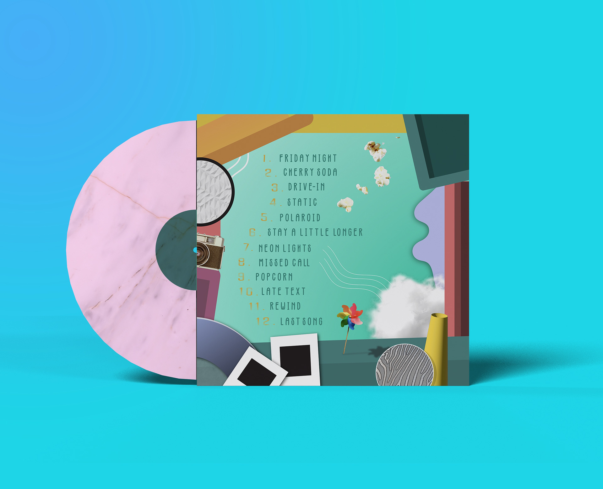 This record design explores themes of nostalgia and youthful energy through a playful, pop-inspired visual system. The composition combines 2D and 3D geometric forms with photographic elements to create a dynamic, slightly chaotic aesthetic, balanced by an underlying grid structure on the cover. A vibrant color palette reinforces the upbeat tone of the music while enhancing the sense of movement and spontaneity throughout the piece.