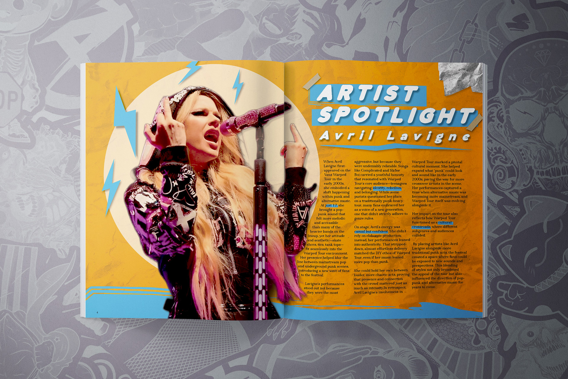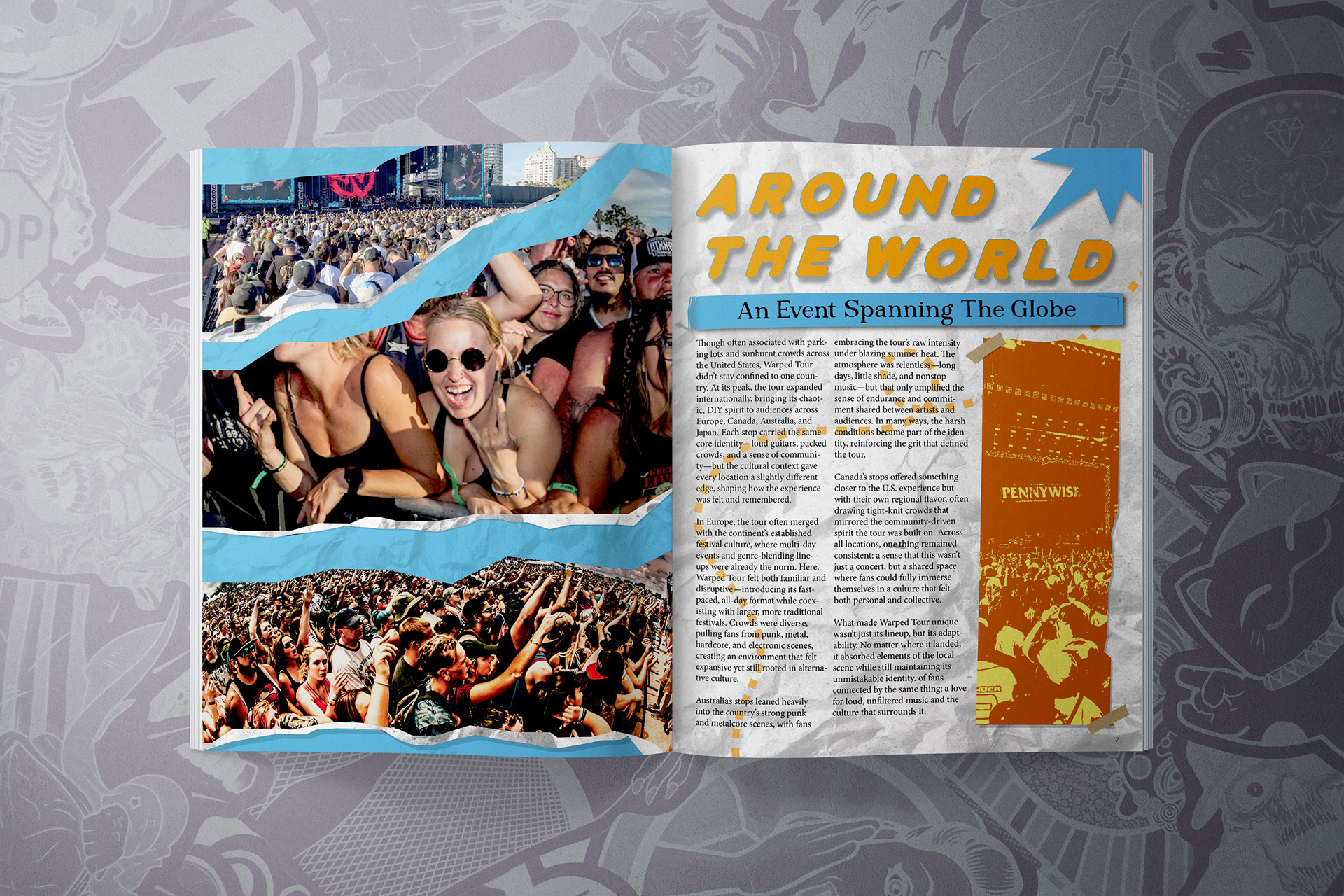 This editorial spread captures the high-energy atmosphere of Warped Tour through bold typography, bright color, and layered DIY elements like torn paper, tape, and lightning motifs. The design balances chaotic, punk-inspired visuals with an underlying grid system, creating a composition that feels both expressive and structured.