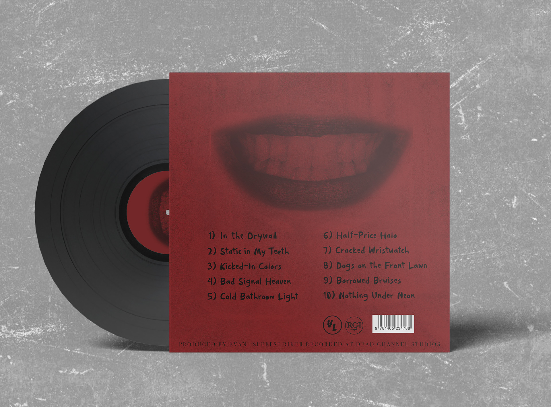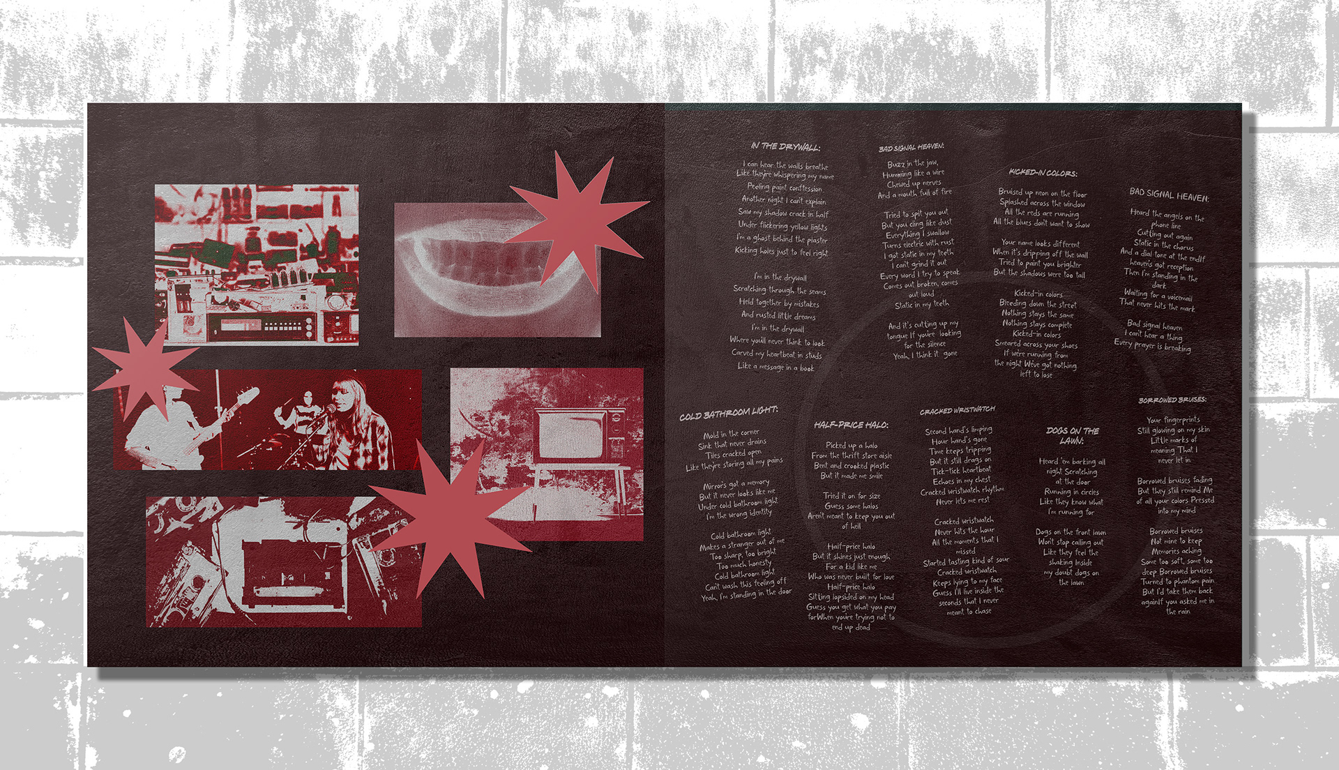 I created a record design and cohesive visual system for an alternative rock band inspired by 1990s DIY punk aesthetics. The project features high-contrast monochromatic imagery, bold colors, and a deliberately tactile, disorganized feel. Deliverables include a front cover, back cover, and liner notes, as well as a series of mockups demonstrating the record’s application across physical formats.